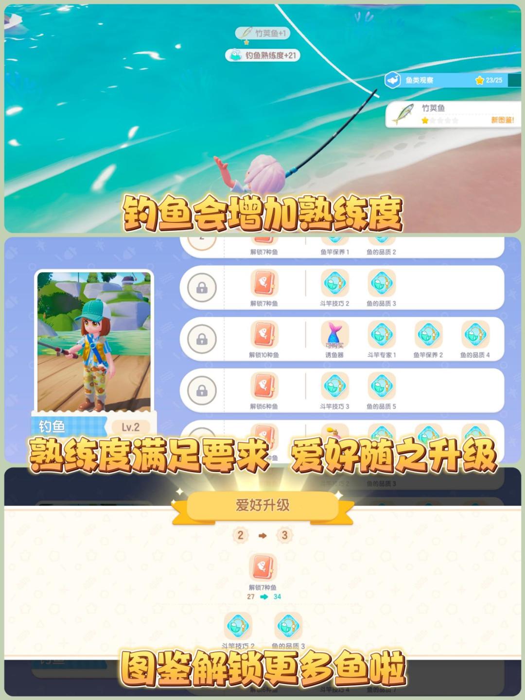 🔎其次,通过对比来看,海鱼的价格相对来说比较贵,以海鱼中的鲣鱼为例,普通的一星鲣鱼售价为210金币/条,河鱼中的一星青虾和湖鱼中欧白鱼的价格仅是50/条,所以大家可以优先去海边钓。如果运气好钓到高星级的鱼,那恭喜它比低星的更值钱。伴随着钓鱼次数越多,熟练度越高,满足条件便可给爱好升级,升级的好处多多,例如提高鱼竿耐久,钓到高品质鱼的概率提升等。