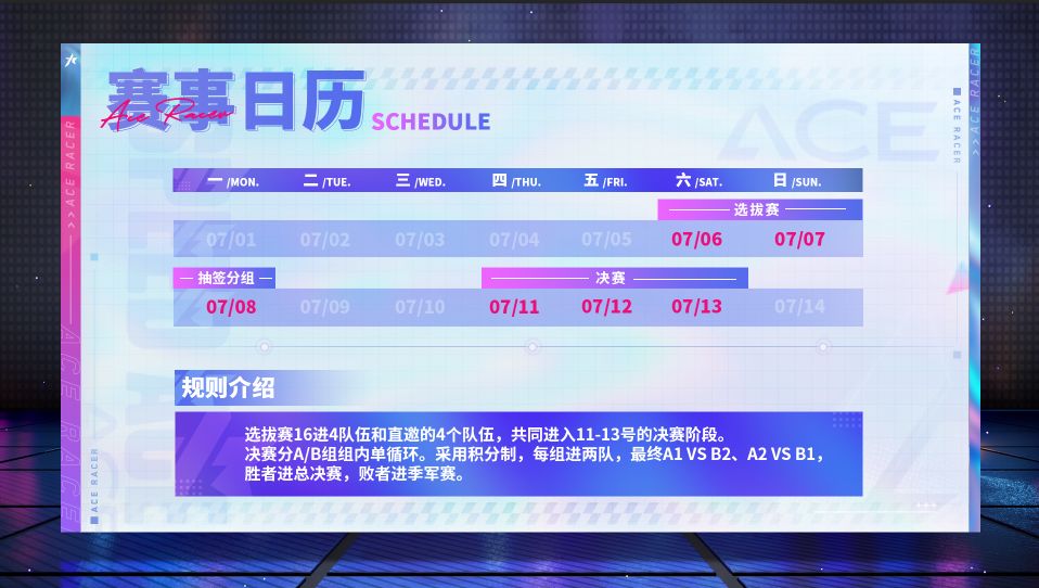 在7月6日到7日的选拔赛中,天梯排名前100的车手们,在经过报名组队与两天的对抗后,最终风云星花、深藏不露、潇洒自在和广播体操四支战队率先突围,与四支直邀的明星队伍会师决赛。