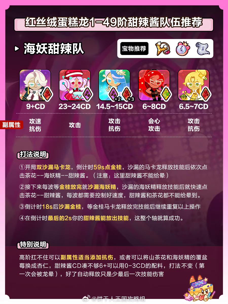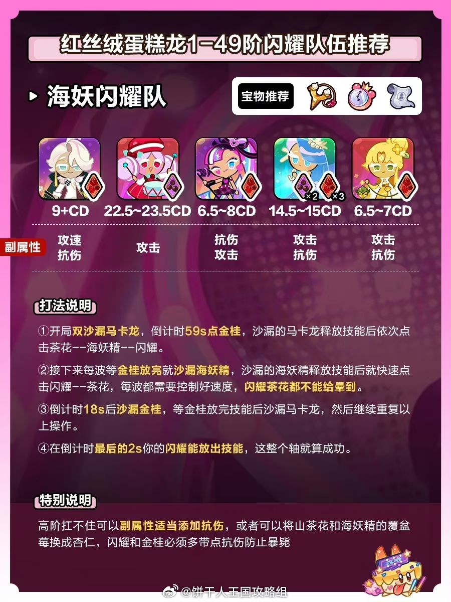 图中所需要的冷却均为饼干面板冷却,不包含组合效果,在阶数较高的时候可以先练习,如果遇到站不住的情况可以配料适当添加免伤,或者用杏仁配料换覆盆莓