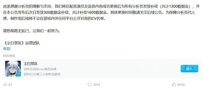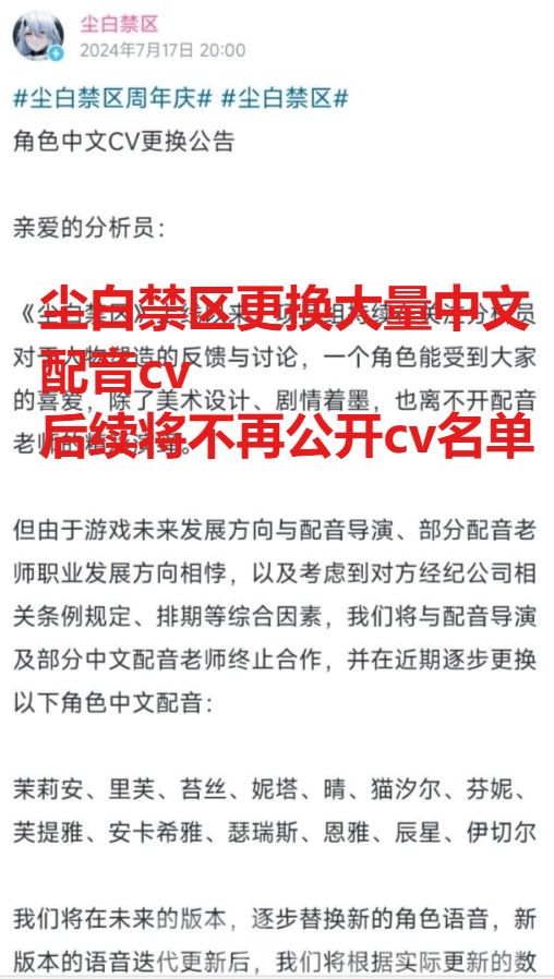 尘白禁区更换大量中文CV,后续不再公开名单