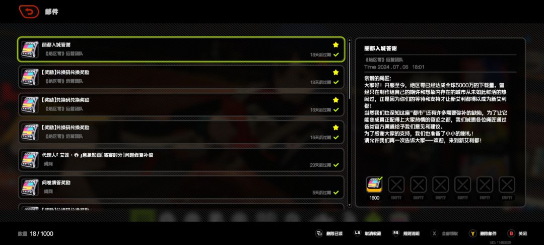 ◆首先这个【绝区零】的福利想必大家都是有目共睹的啊上线送一百抽(不记后续的活动),这是本up主的邮件收到的菲林啊