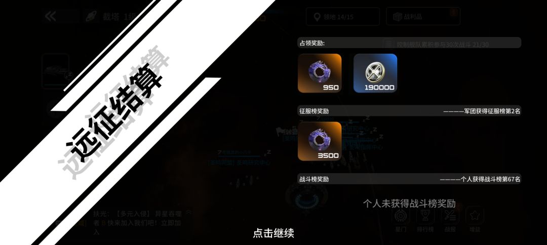 三.团战里面还有个排行榜,是个人的,这里面拿的奖励你也很丰厚,在你的团队实力不足的情况下,也可以让自己强行分一杯羹。