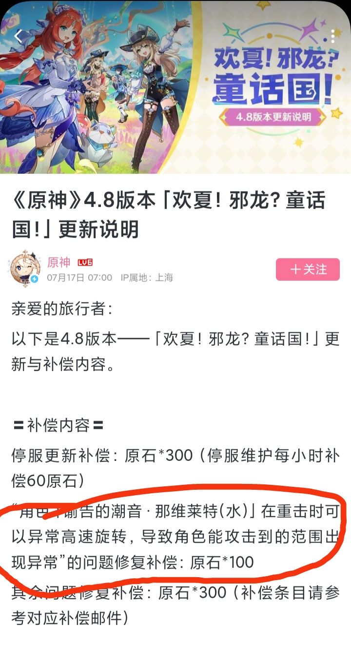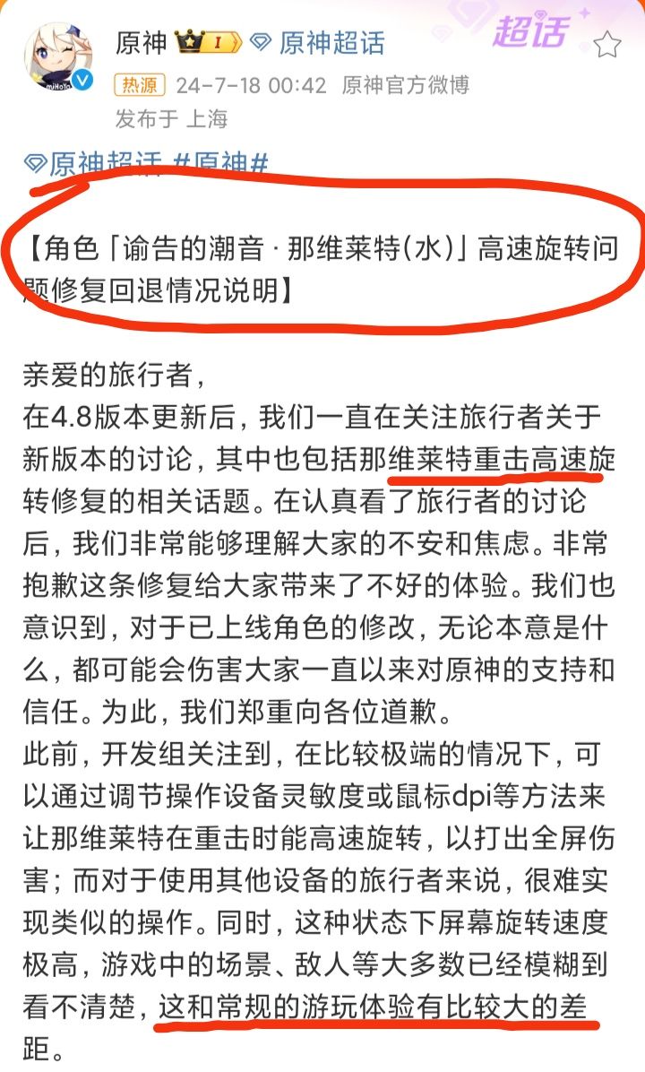 7/18号凌晨,原神官方表示,在4.8版本更新后,一直有关注那维莱特重击高速旋转修复的相关话题❗❗❗