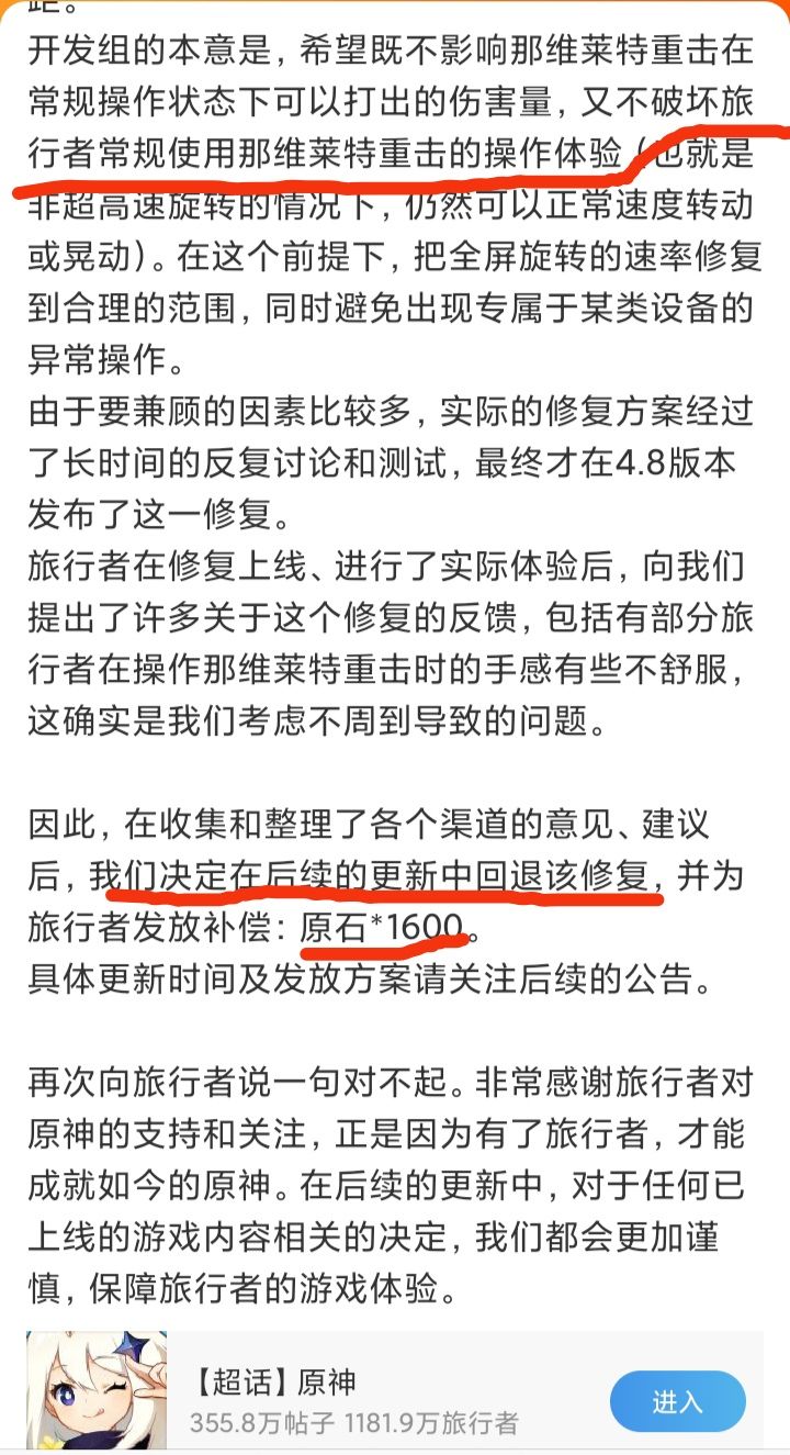 事情闹大后,决定在后续的更新中回退该修复,并为旅行者发放补偿:原石*1600