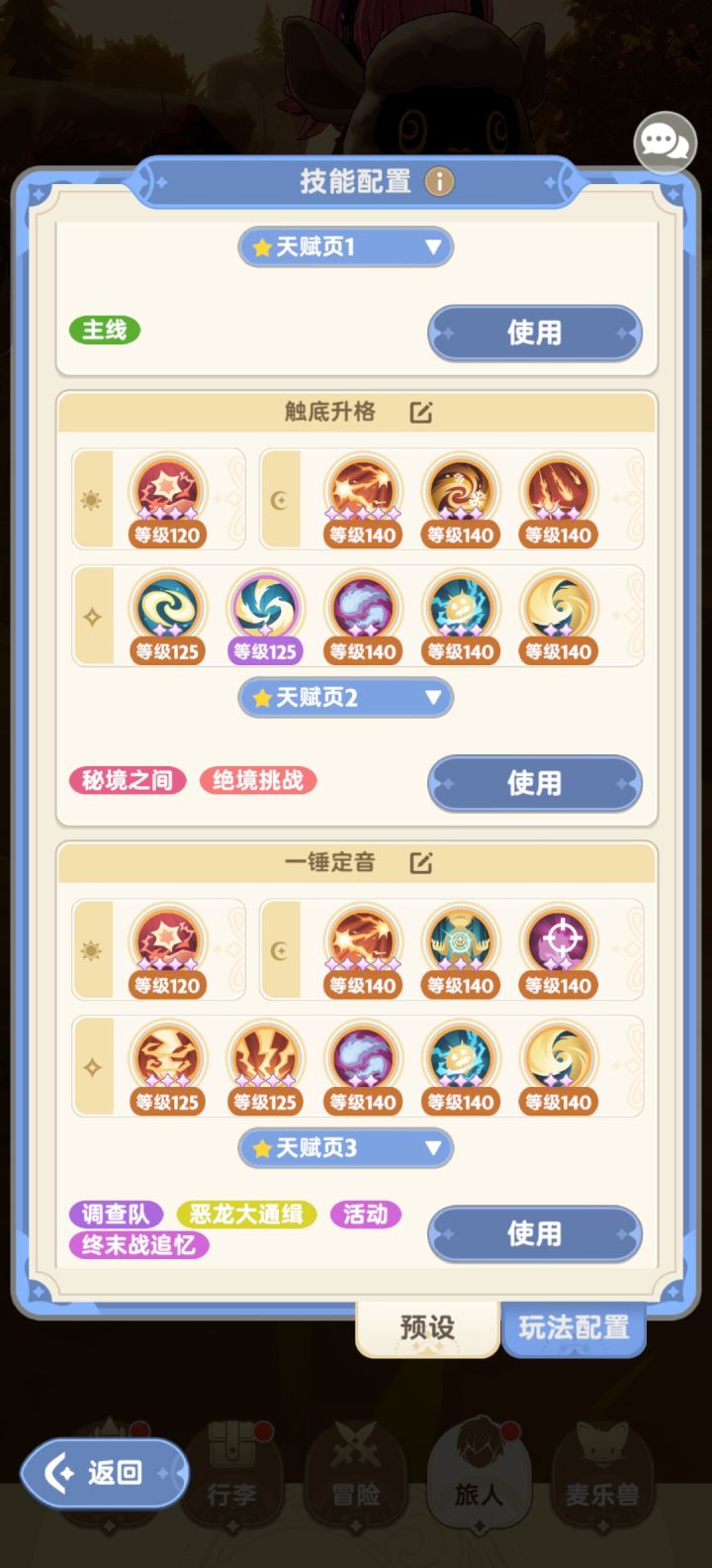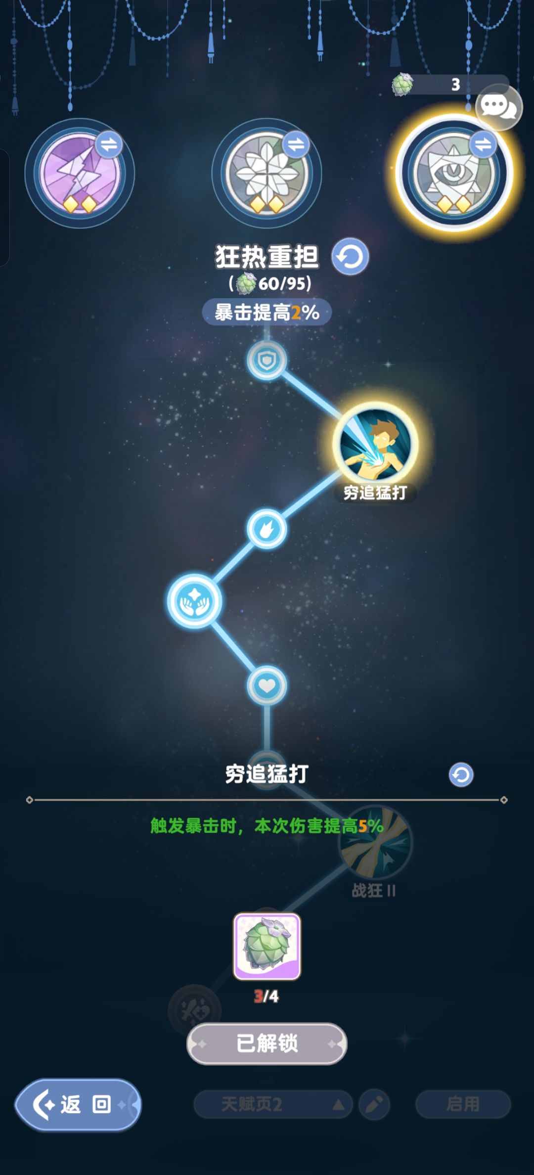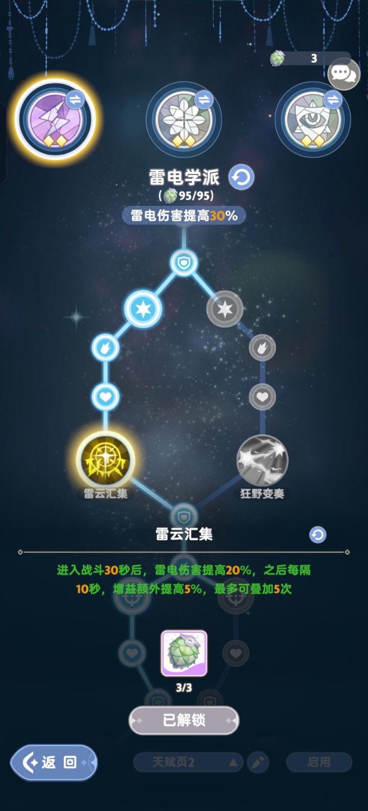图3、4、5天赋:雷电学派右左左右右,需要注意撑到30秒之后吃到伤害加成,也可以右中左右,能省下一堆天赋种子。触底升格点满,狂热重担点到5%增伤(这个等级肯定够了)