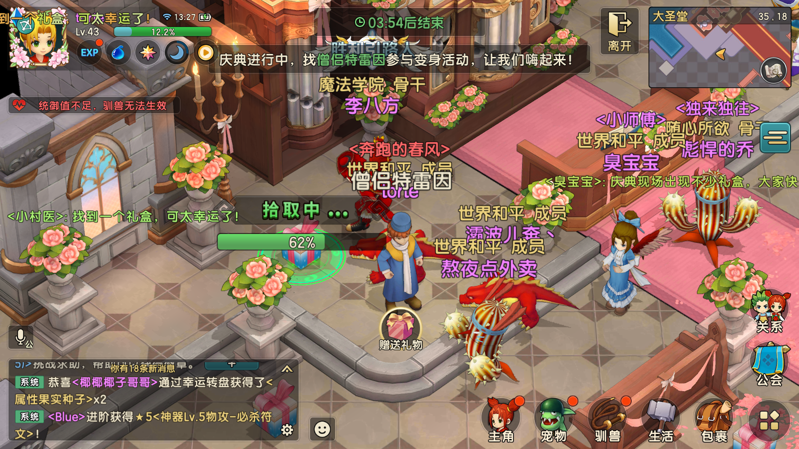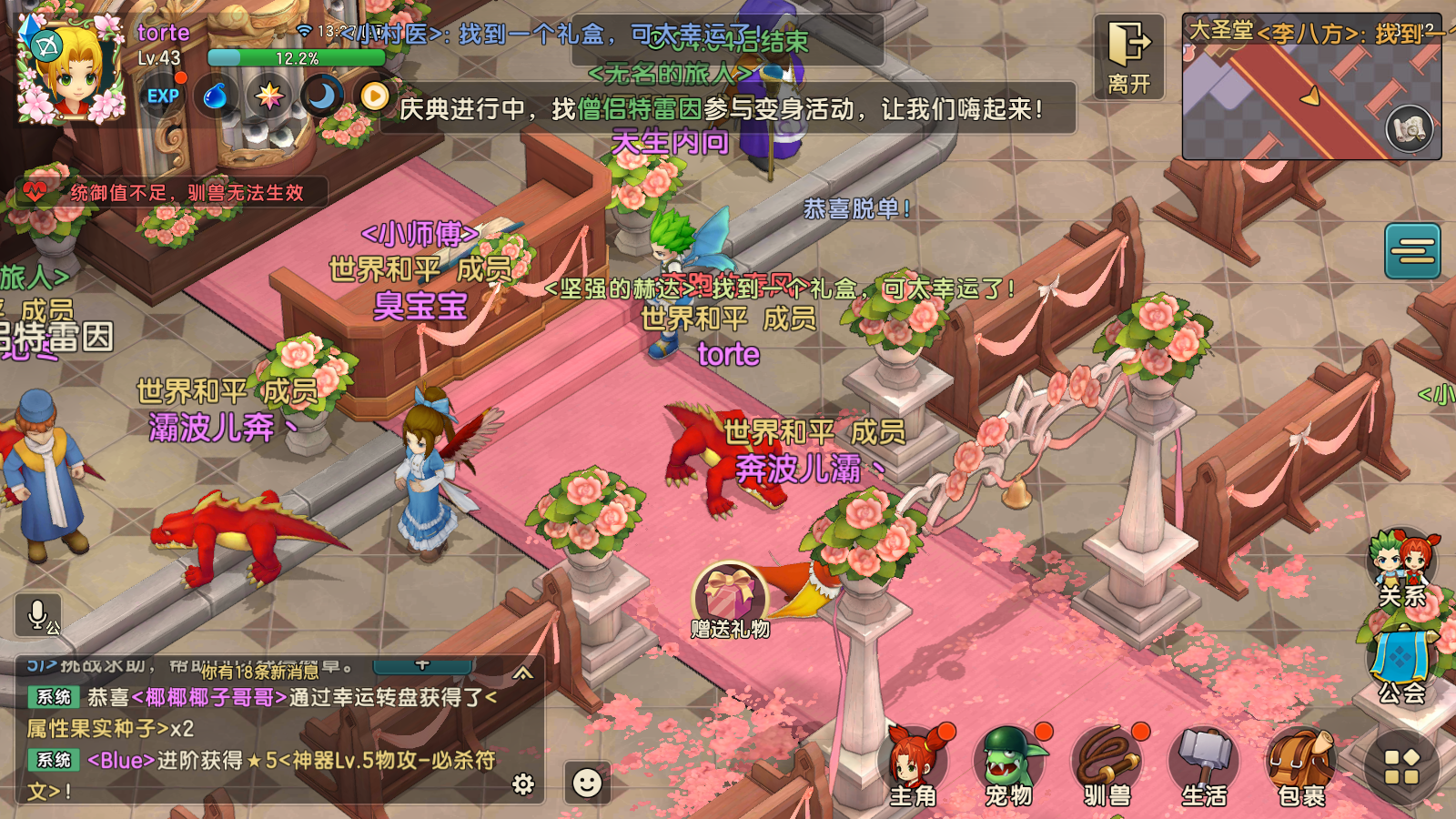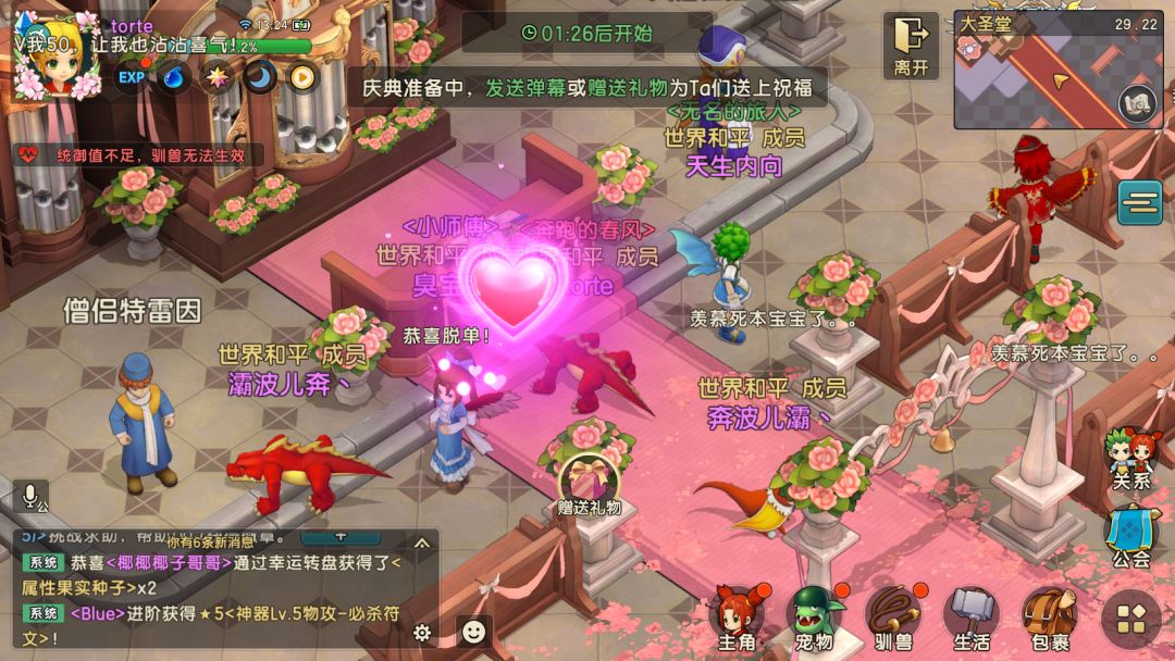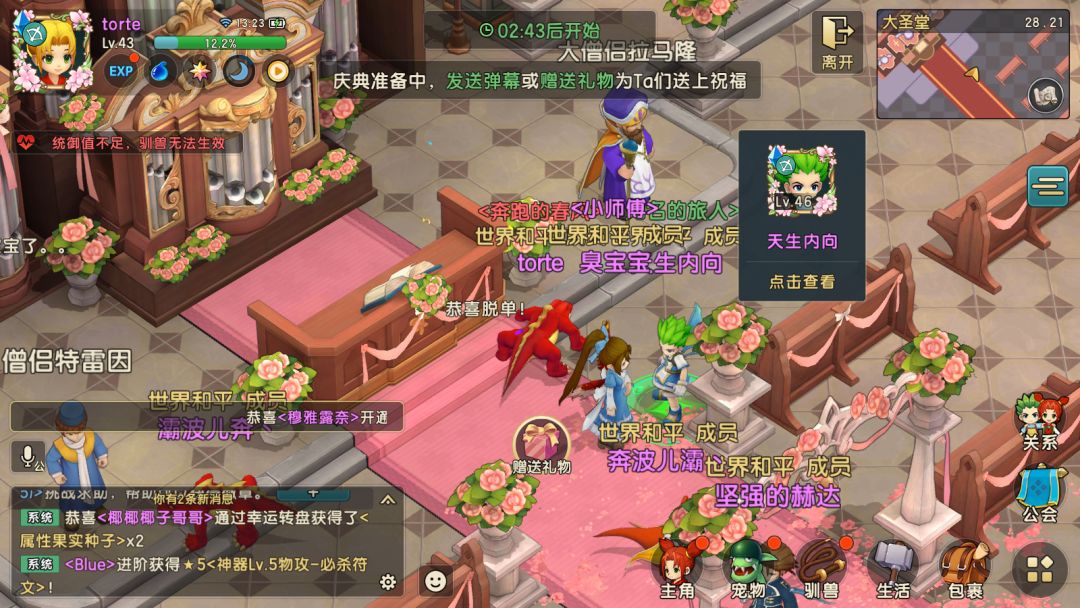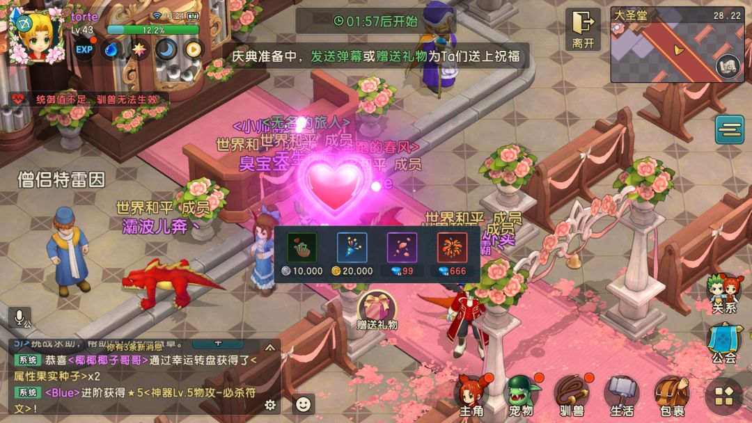 公会里的一对新人结婚啦,过来见证下,送出自己最真挚的祝福,参与新人婚礼有意外福利,可以和好友们开礼盒赢取资源。