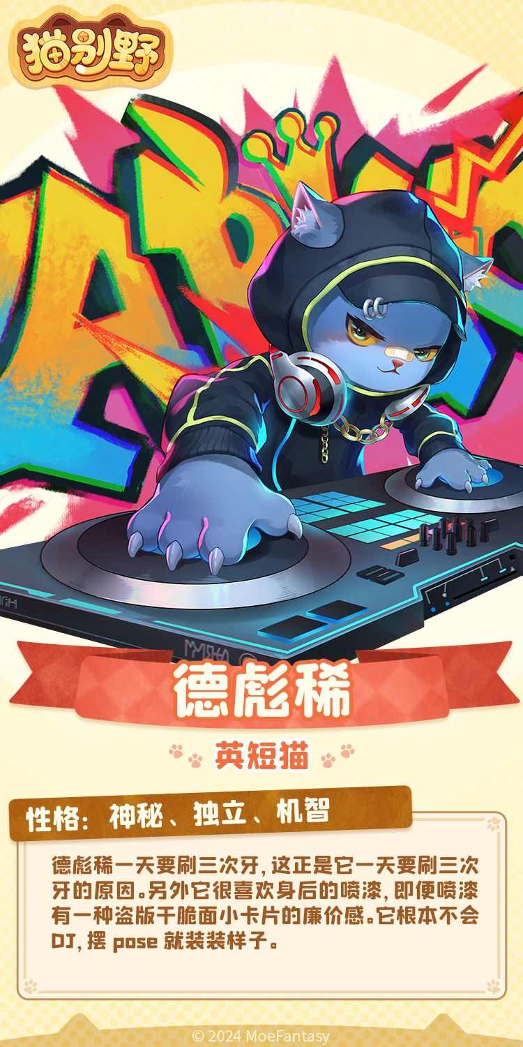 猫咪故事:德彪稀一天要刷三次牙,这正是它一天要刷三次牙的原因。另外它很喜欢身后的喷漆,即便喷漆有一种盗版干脆面小卡片的廉价感。它根本不会DJ,摆 pose 就装装样子。