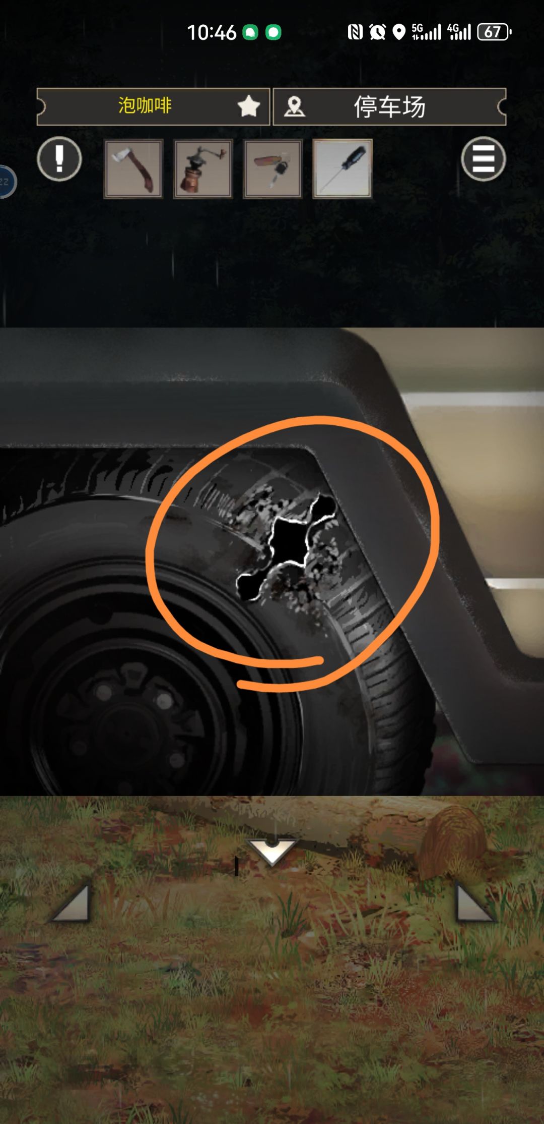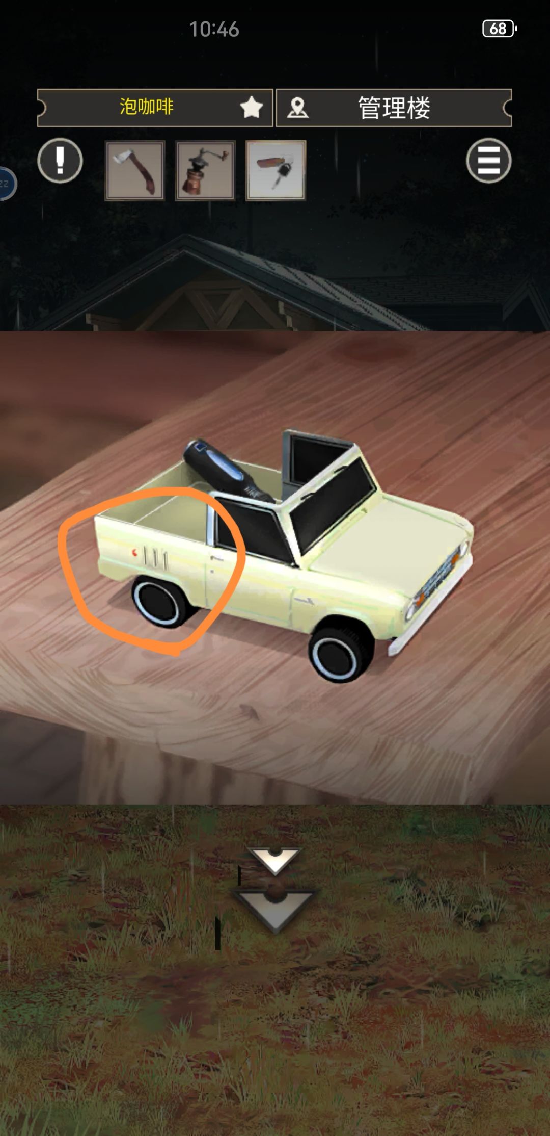 【图⑦~⑧】 图⑦是放在管理室一楼桌上的汽车模型,图⑧是主角自己的车右后轮胎的破损(我怎么看怎么像是破损),这个破损我当时还以为是走的时候要修车补胎,想不到居然是打开营地管理室汽车模型的提示。因为这两个车长的一样我其实有联想到,但车轱辘破损和模型车门开关,以及一个是营地的东西一个是我自己的车,这两个联系到一起真的就很生硬了,可以说是撇开了情节逻辑不谈了。