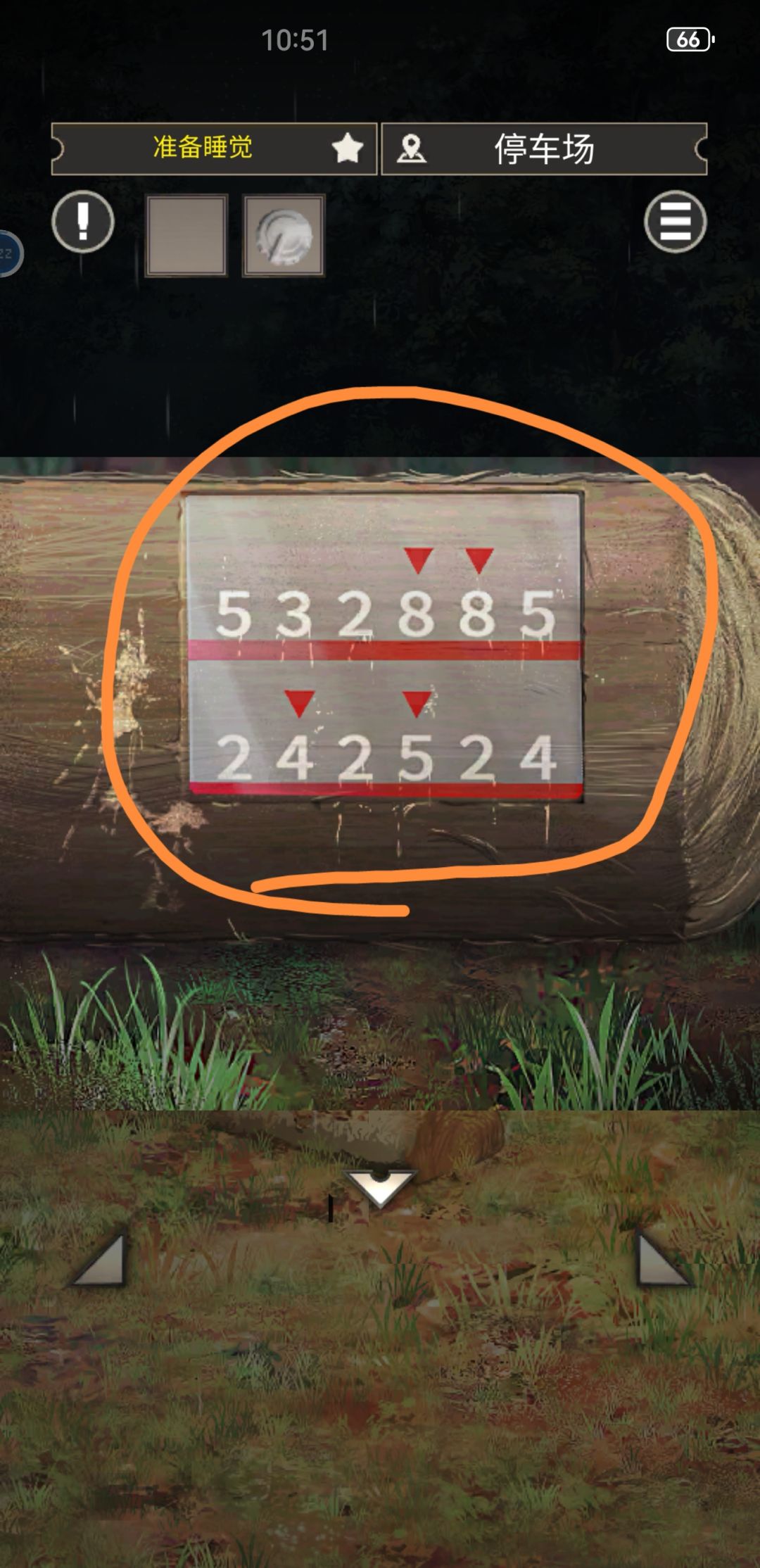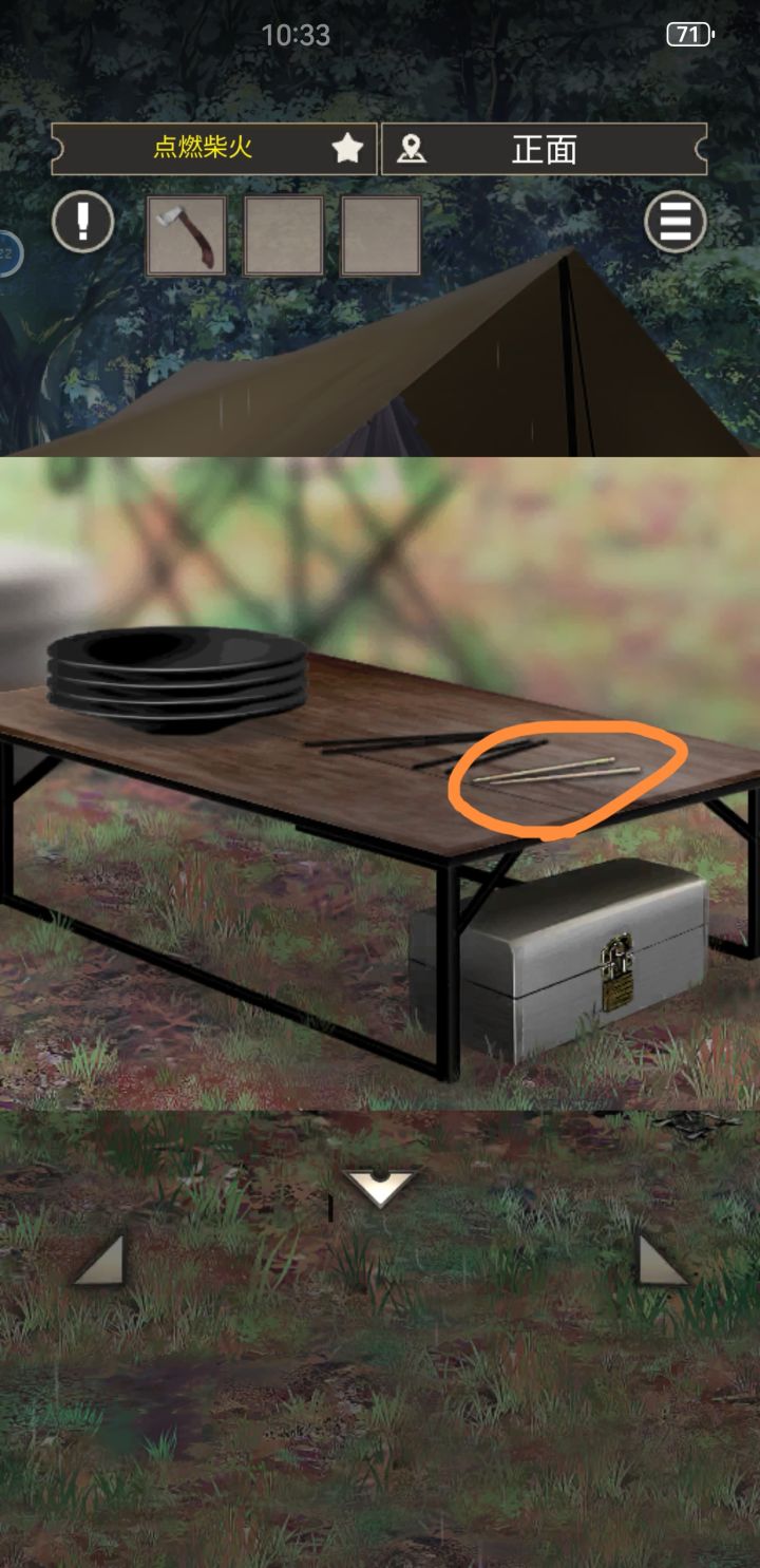 【图②~③】 图②里桌上的第三双筷子,玩过的都知道,这是我们之前从木柴上削下来的倒刺。紧接着到了图③的密码环节,上面提示的○和=代表着盘子的数量和筷子的数量,那怎么筷子的数量就是3呢,正确答案里还要把“不可预估的变量”也加进来?难道在设置这个密码的时候就知道会有劈柴劈出倒刺还以此多做了一双筷子?