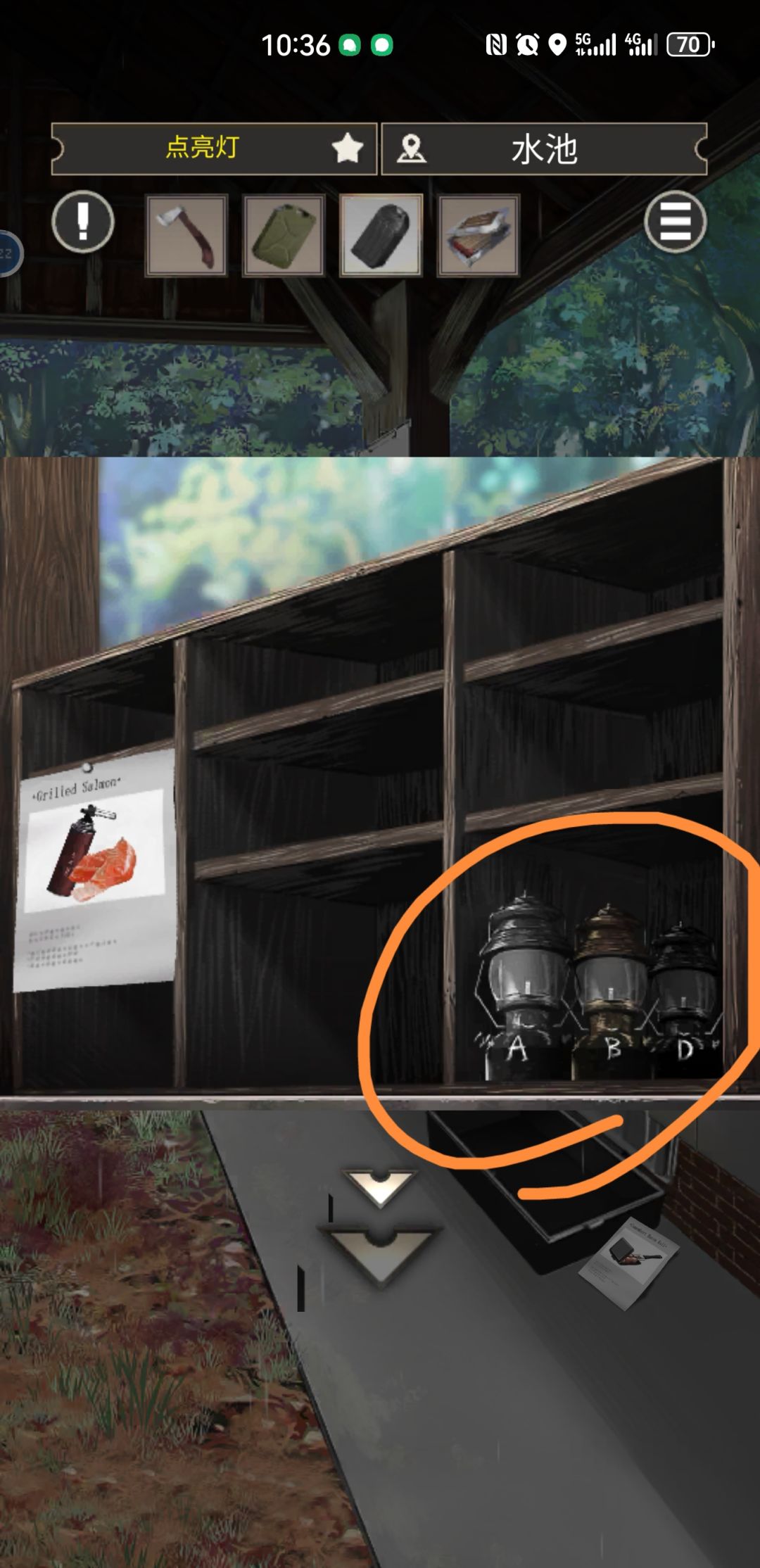 【图④~⑥】 图④是主角说自己带的灯坏了,要去营地找灯,然后图⑤架子上三盏灯是营地提供的,结果图⑥输入密码的时候,要把这四盏灯的颜色和字母对应起来,咋的?营地还知道你一定是带了“C”灯过来吗?