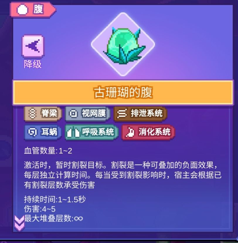 利用切割每次跳伤害时可以根据已经叠加的层数让怪物有一个易伤效果使受到的切割伤害增加(每有一层切割层数切割的下次伤害都会增加,层数无上限增加的伤害无上限),这个易伤效果是可以叠加并且无上限,但是需要注意这个易伤效果只有切割伤害可以吃到加成,虽然层数时间只有一秒但可以配合子嗣和子弹分裂高频率短时间内叠加切割层数,让伤害个位数的切割伤害呈指数级增长,每秒让伤害递增到百万甚至更高。