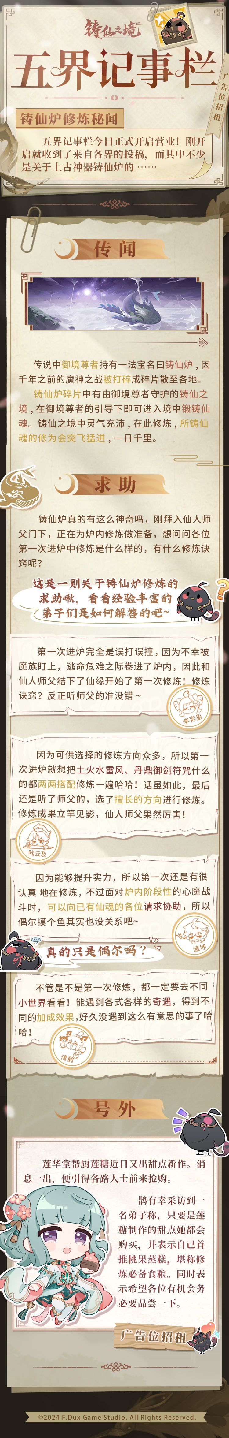 而在试营业的第一天,鹊就收到了大量投稿~其中有许多与上古神器铸仙炉有关的内容,修炼问题什么的果然需要交给更专业的人(!),所以鹊邀请了弟子们来协助解答!话不多说,快来一起看看吧啾!