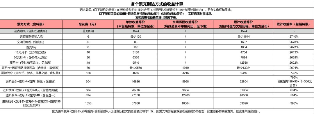 此表中关于文明历程的收益统计于内测,可能与当前版本存在一些出入,仅供参考。