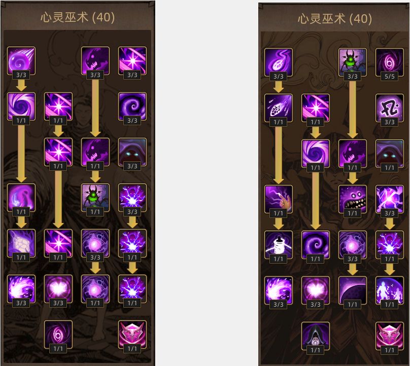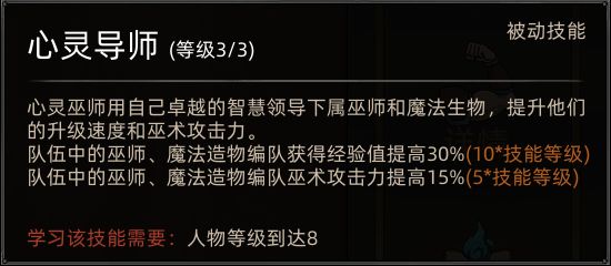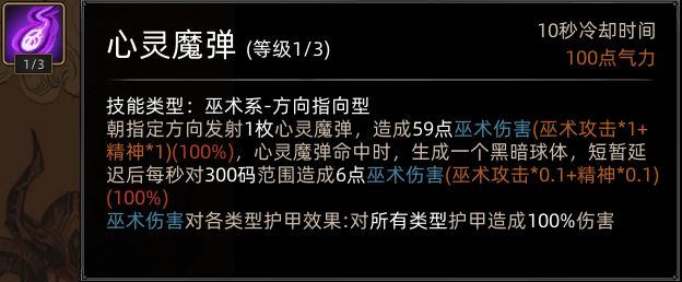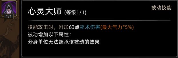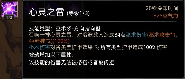 心灵巫师的前期发育能力,仅靠本身技能页较弱,心灵魔弹AOE不足,配合魔影召唤在发育期略显墨迹,学习通用巫术技能页(火冰雷光暗)后会有所改善,中期学到被动心灵大师后近乎质变,这个被动配合多段伤害的巫术技能伤害会很高(如火山),后期上限未知的原因是作者跑测未玩到后期。