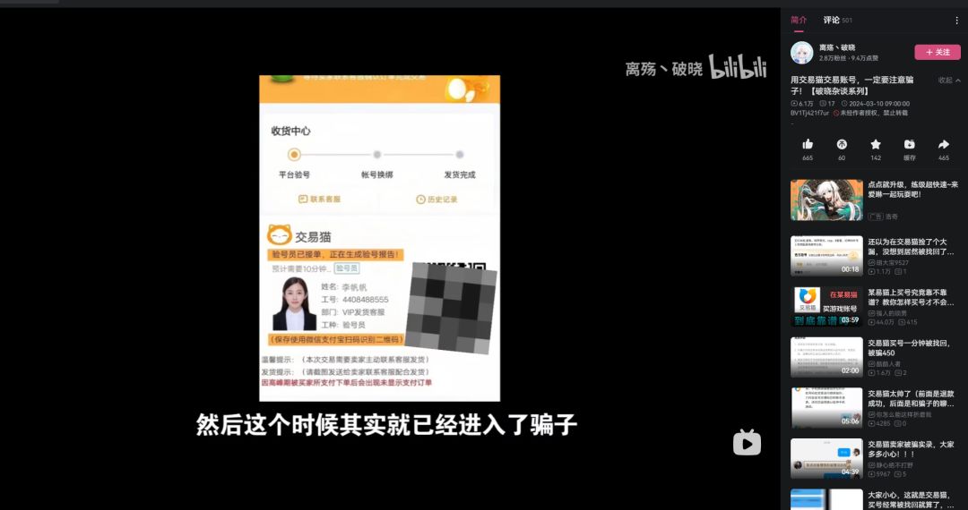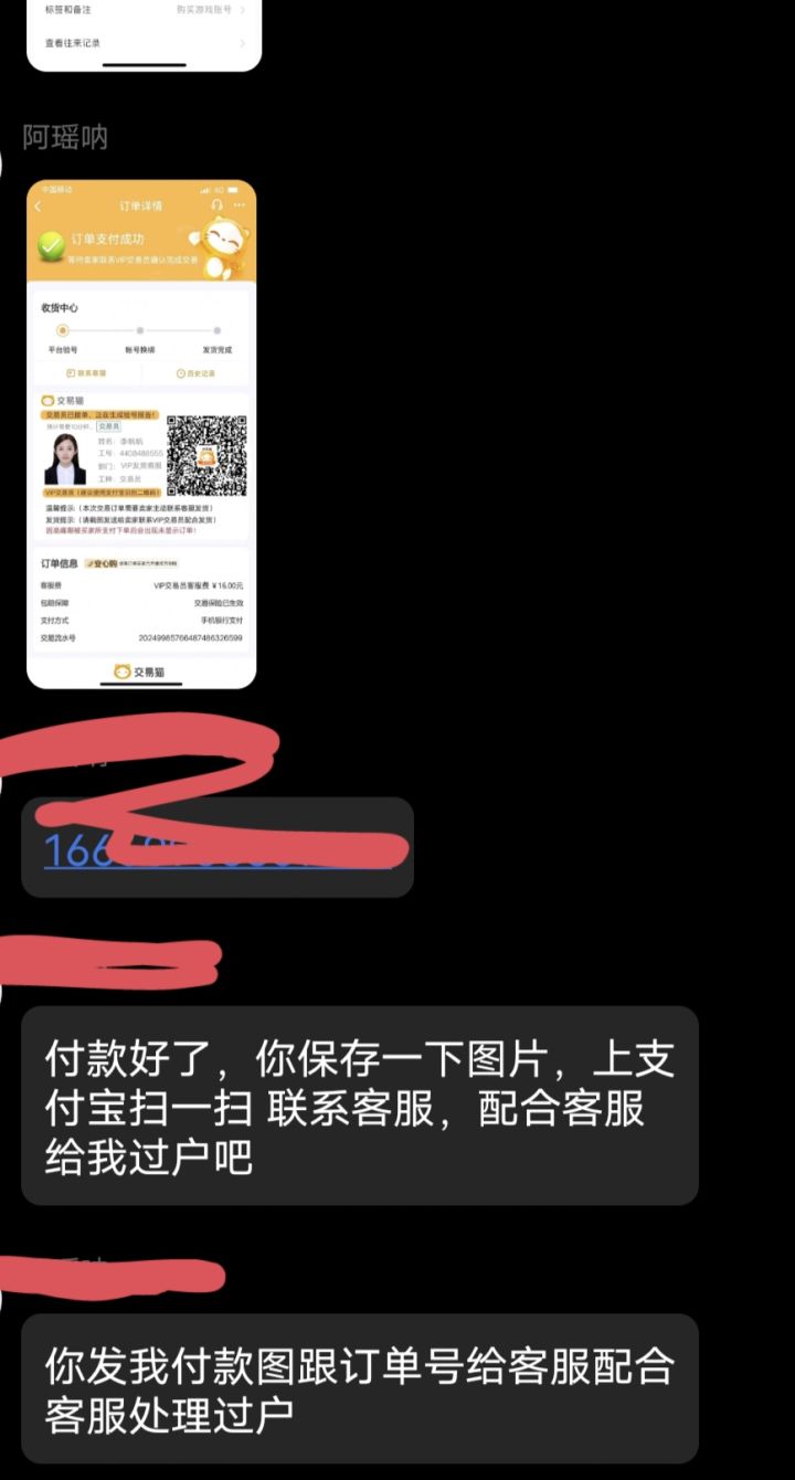 然后加了QQ之后会提出走交易猫平台,你上架之后他会让发手机号,说要走vip客服,并给出一张付款截图,让你扫码去和vip客服联系,然而事实上是,平台内根本没有被拍下