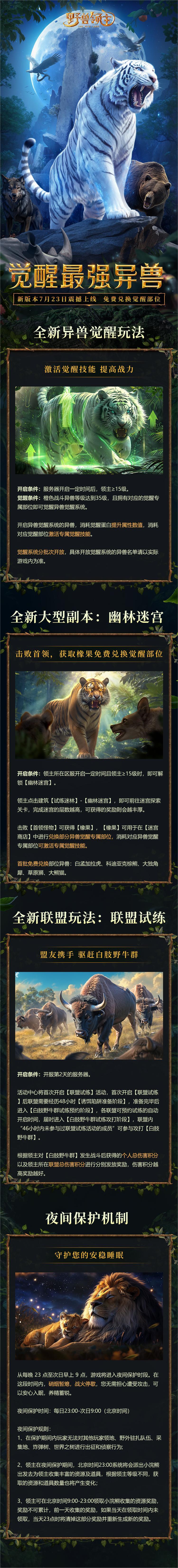 本次将更新全新异兽觉醒玩法、大型副本幽林迷宫、全新联盟玩法联盟试炼以及夜间保护机制四大玩法!