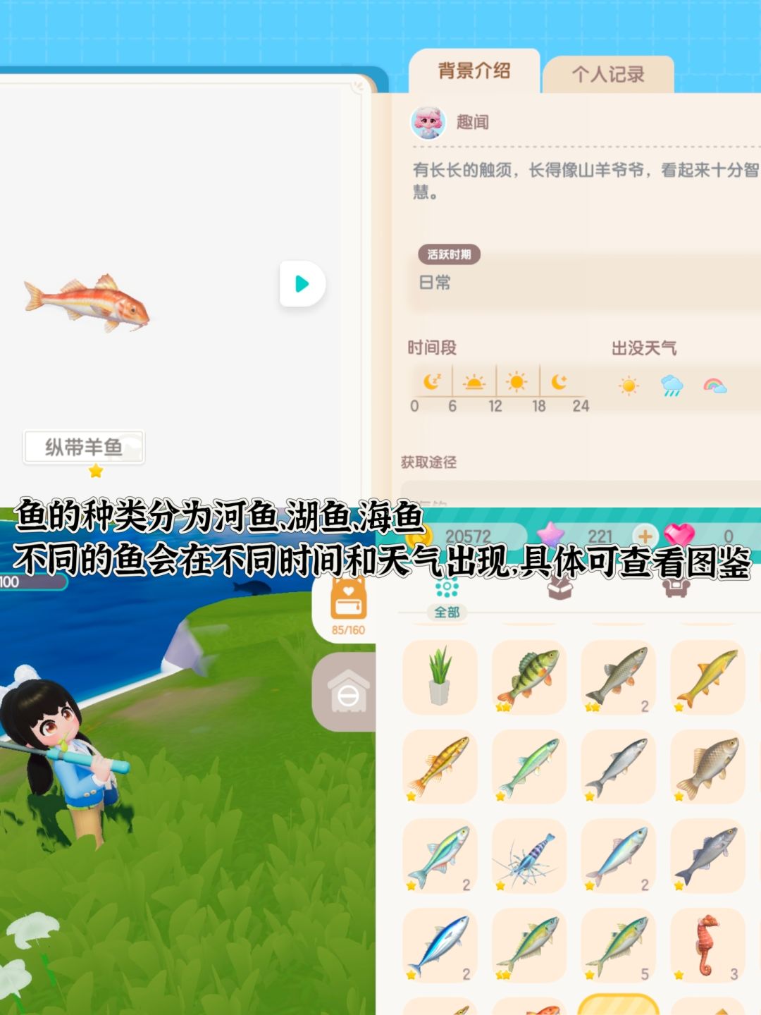 3.鱼的种类一共分为三种,不同类型的鱼生活地区也不同,有河流、湖泊、海洋,不同品种的鱼有各自出现的时间段和天气,具体可查看图鉴