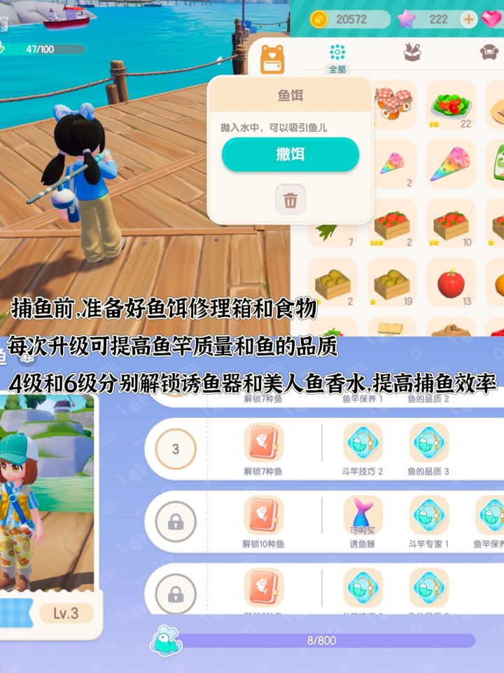 2.捕鱼前,准备好鱼饵、修理箱和食物,食物方面建议选择便宜的食物;每次提升🎣钓鱼爱好等级都会提高鱼竿质量和鱼的种类和品质,4级和6级解锁诱鱼器和美人鱼香水,对个人和团队捕鱼作用都很大