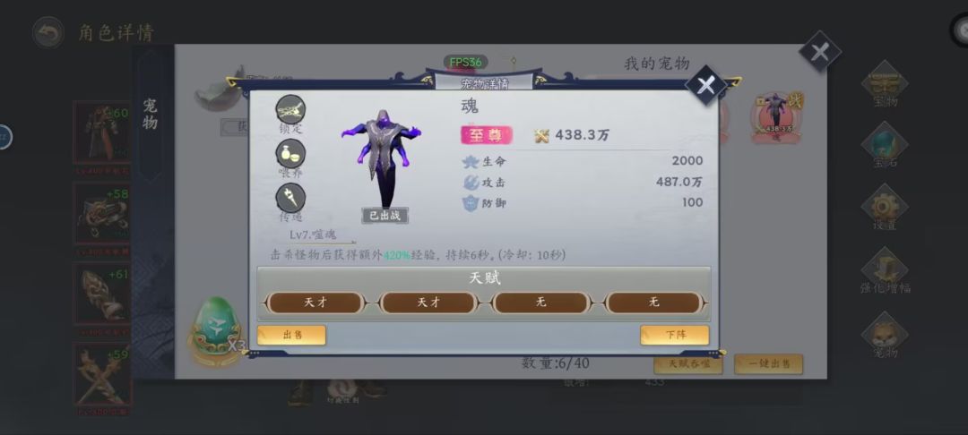 当然,不欧的话就需要花更多的精力去养副宠,比如把需要的主宠培养成3天才之后,副宠也培养到3天才,然后主宠对副宠进行吞噬,这样有3/8的概率培养出4天才宠物,嘿嘿!