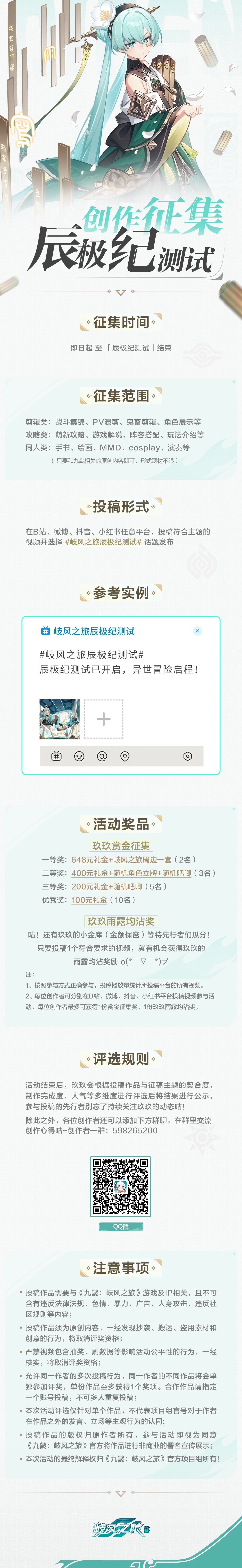 带上#岐风之旅辰极纪测试 tag,投稿参与征集活动,最高可得648礼金!玖玖已经整理好参加攻略啦,请先行者仔细阅读下文查看。