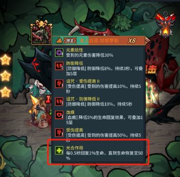 食人巨花自带30%的元素伤害降低buff,在生命值下降到一定血量的时候会触发“光合作用”增益buff,持续回血,玩家可以把爆发技能留着,待buff触发时使用。