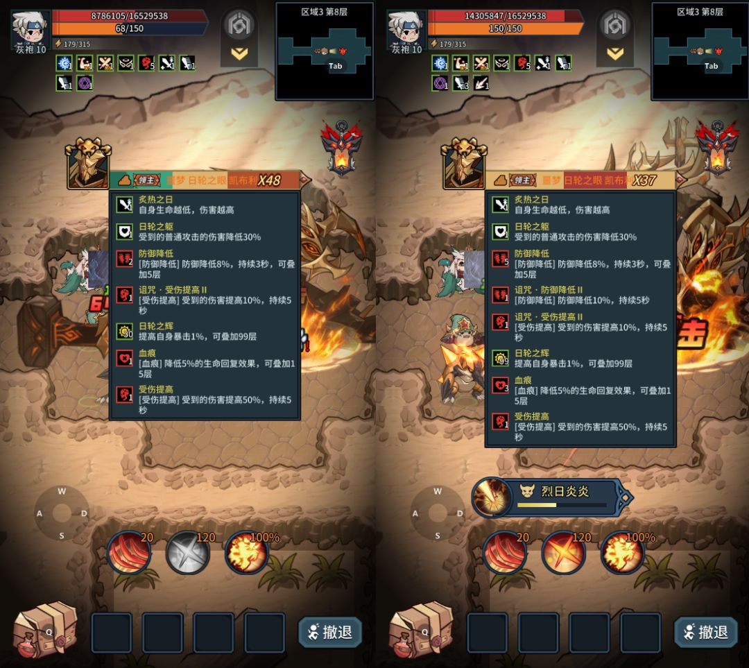boss日轮之眼自带增益buff,血量越低伤害越高,受到的普攻伤害降低,boss攻击时会叠加“日轮之辉”层数,提升自身暴击,boss在低血量使用技能“烈日炎炎”的时候,提灯者很容易出现血条消失术,被瞬间秒杀。提灯者可以通过强化装备、升级契约兽把自身属性提高,在boss低血量的时候使用爆发技能带走boss。