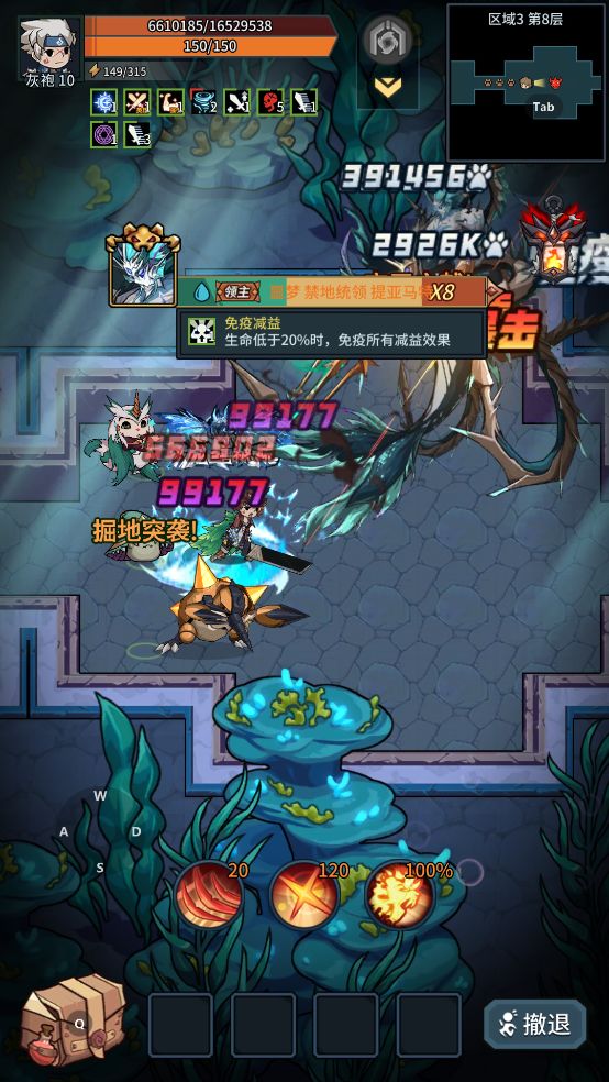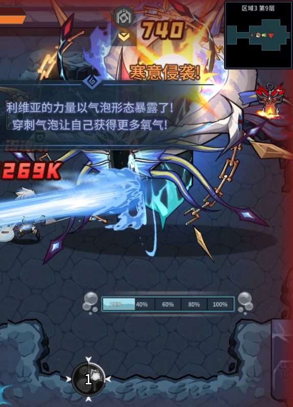 当屏幕出现飘字提示时,此时点击“刺穿泡泡”,可以回复氧气值,完成boss机制。氧气值过低时,在保证不了一击必杀的时候,不要使用技能。