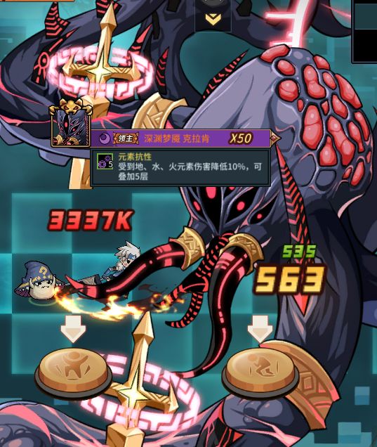 同时boss自身会有地、水、火三种属性的伤害降低buff,有对应属性的契约兽伤害会降低。