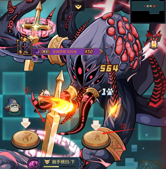 机制:触手横扫,屏幕中间会出现读条,会显示上或下触手拔剑攻击,提灯者需要在读条过半的时候点击对应按钮(左上右下),此时尽量不要放技能,避免来不及点击按钮,即可躲避伤害。