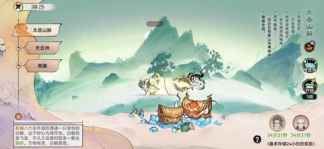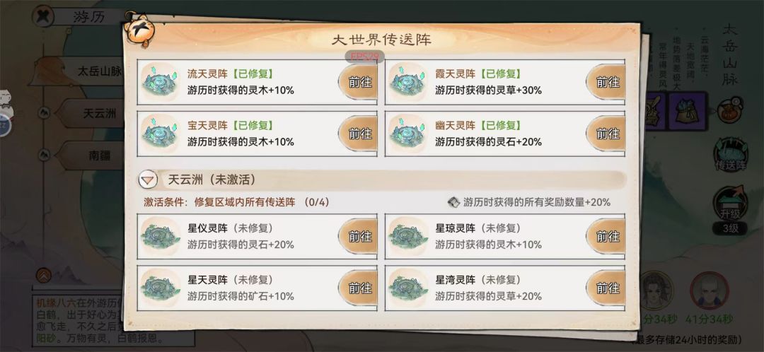 - 一个地方的传送阵1小时能获得1灵玉和5宗门声望。(有两人一起游历的情况下)