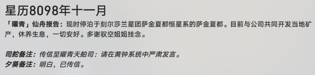 从立绘的信息来看,接下来我们将有机会踏上仙舟联盟的其他战舰——曜青,根据仙舟资料记载,曜青在联盟中主征讨,有部队“青丘军”,其将军正是我们立绘的主角飞霄。与罗浮的「垂虹卫」、「春霆卫」、「毕方卫」、「欃枪卫」相同,曜青上也有两支实力极强的云骑舰队:「鹤羽卫」和「丹歌卫」。联盟的各艘仙舟之间会通过黄钟系统相互报告现状,我们可以通过「罗浮」仙舟星历8098年的黄钟系统共鸣记录来了解这艘仙舟的情况: