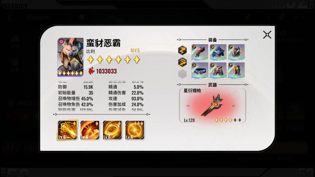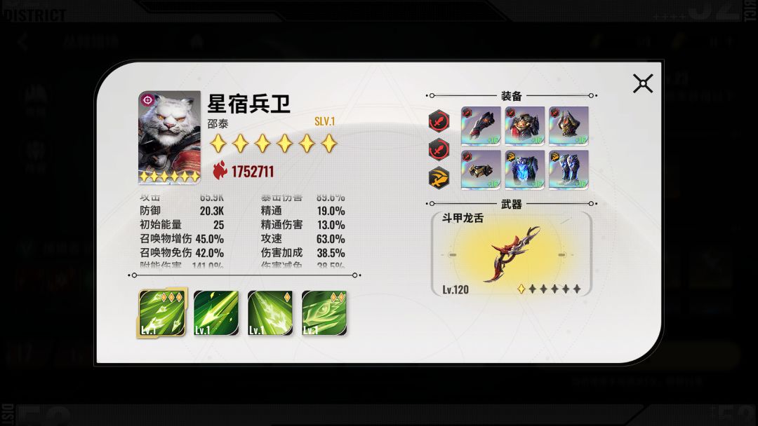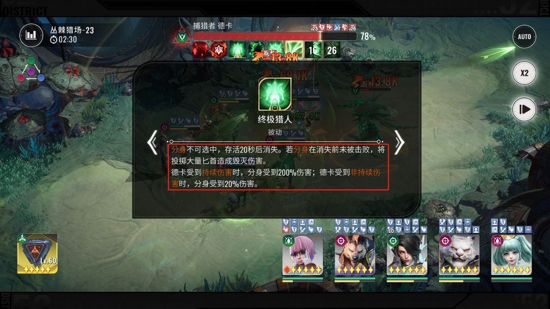 20秒内无法击杀,会造成全屏秒杀伤害 所以这里输出不够,攻速来凑,分身是吃持续伤害200%的伤害,我白虎,豺狼练度较低,装备很次,所以我选择的攻速鞋