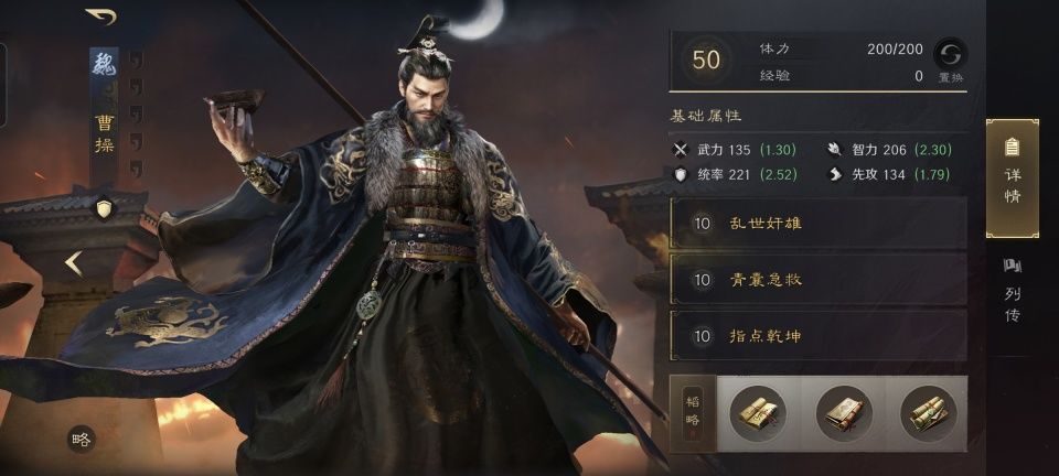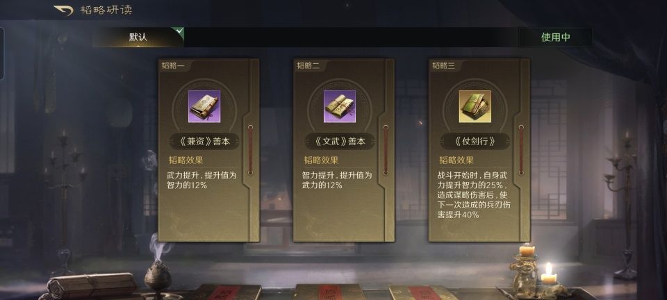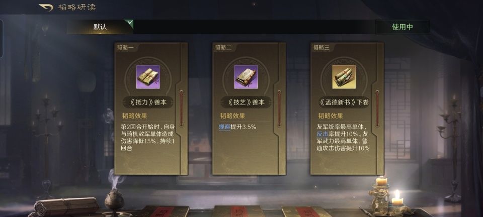 平心而论,这一场的箕形阵在我看来摆得有点奇特,更有几分冒险。因为我本来以为前排当肉盾的会是默认持有乱世奸雄战法的曹操,可太平丨皮皮却剑走偏锋的摆出了袁绍。袁绍的合聚群雄战法,在这支队伍里无疑会激发徐庶对敌方队伍里智力最低的吕布进行猛烈的进攻,如此精确制导的工具人还往前面推,是真的相当大胆。第二和第三战法,分别学习了避其锐气和铸甲销戈,这求生欲倒也是拉满了。韬略库必带世家以激活群雄增益,侦势善本则是给徐庶和曹操都追加了谋略伤害。