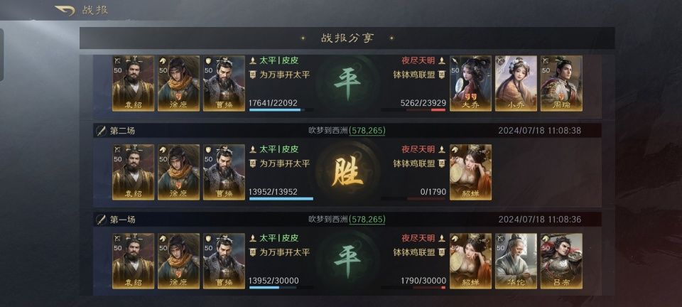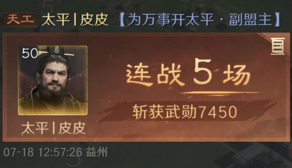 由衷的感谢这位游戏ID名为“太平丨皮皮”的玩家朋友,他在世界公频分享的,是徐庶、曹操和袁绍组成的文武战队与吕布、貂蝉和华佗组成的群骑的较量。纵然吕布神勇无双,最终也还是难逃被徐庶挥剑清退的下场。