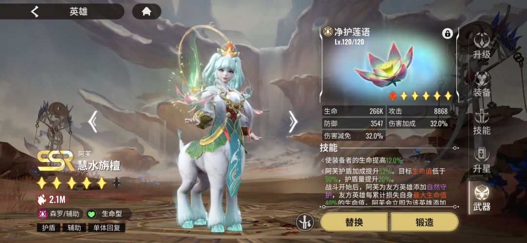 升星可同时治疗三人,实战奶量较粉毛大很多单体奶量:14.3%*生命值(lv6)