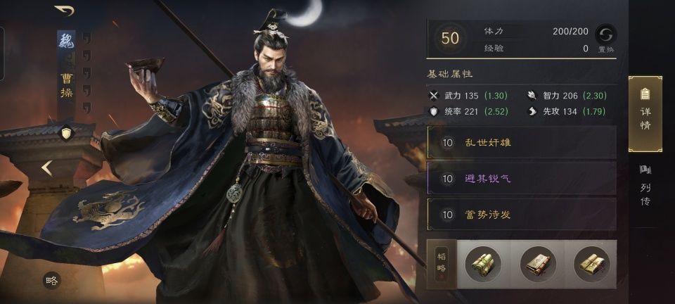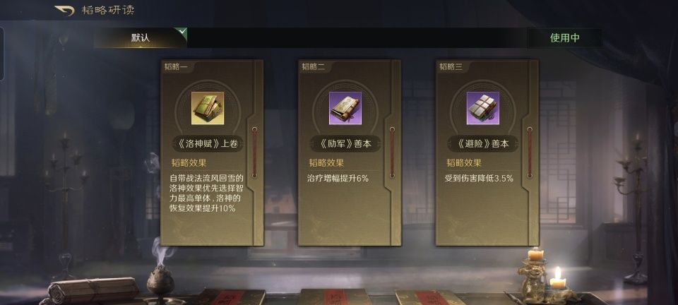 同样与家公曹操在前排掩护郭嘉的甄洛,其流风回雪战法只能是把洛神效果增益给唯一的后排选手郭嘉。第二和第三战法相比之下就配得草率了些,青囊急救和上智为间在此就一笔带过。韬略库研读了洛神赋上卷,算是把洛神的效果锁定到了全队智力最高的郭嘉身上。励军和避险的善本,则是为了让她和曹操能在前排支撑得更久。