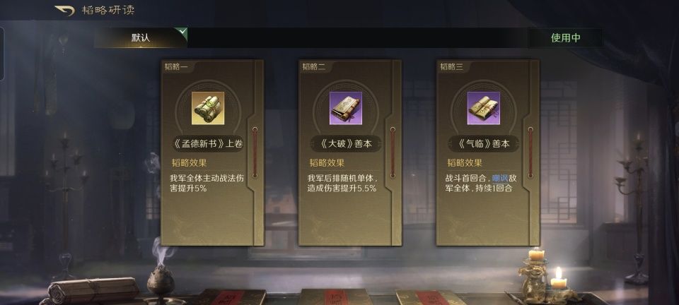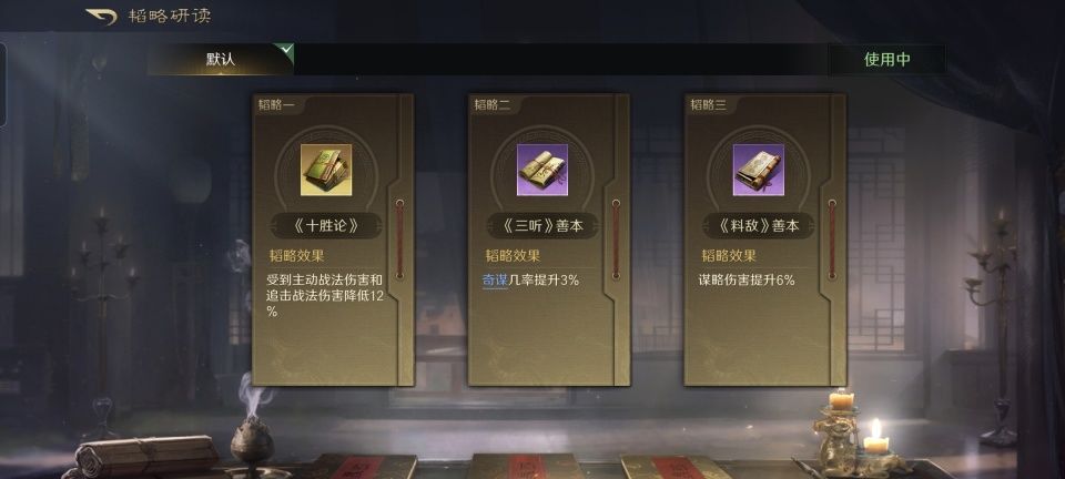 郭嘉压轴登场,他是提供全队输出功率最关键的发动机!在算无遗策的基础上,后续装备了文武双全和出其不意,这是要瞄准庞德发力的节奏!还有个小彩蛋,就是之前甄洛搭配的第三技能上智为间,这算是全队唯一可以给对面施加的负面效果。再结合出其不意来看,此负面状态可助力郭嘉创造更高额的伤害。金书十胜论之后,郭嘉额外研读了三听和料敌的善本。这两本小紫书都是给郭嘉提升谋略伤害值的,法术的刀锋在此已被磨砺到了极致!