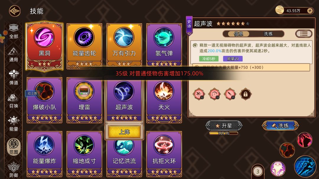 另一个中频攻击的强者是【超声波】,词条拥有普怪增伤、伤害加深、弹道增加,范围全场,非常离谱。