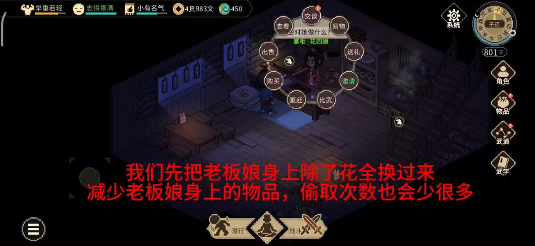 ●来到落魄江湖人身后,长按屏幕中间下面的潜行,进入潜行状态,然后存档,点窃取(这里有点麻烦要多试几次)【没偷到或者被发现就回档】(实在偷不到就回档换一本拳脚功夫,其他秘籍也没啥用)