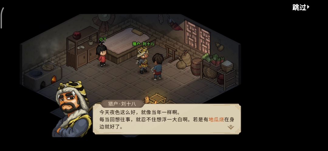 ●支线2,(时间要求戌正时以后,我是在戍正时触发,具体时间未知,道具要求一瓶地瓜烧)在猎人家里,把猎人踢出队伍,背包里有地瓜烧,猎人会嚷嚷着想喝酒,点击猎人对话,选择(行伍出身)得到杨家传闻【正式版【梨花枪法】的前置任务】