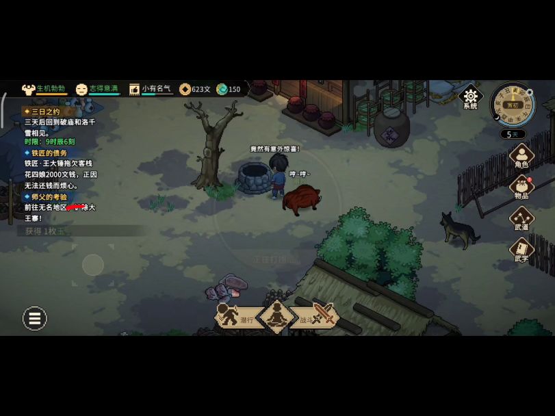 ●跟着我的攻略走,做完猎人任务,名声会达到(小有名气),然后出大地图,收到飞鸽传书,返回无名小村,接到大王寨任务
