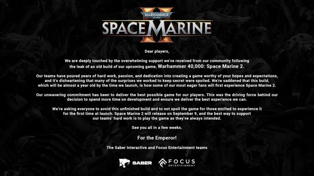 “亲爱的玩家们,在我们即将推出的游戏《战锤40K:星际战士2》的旧版本泄露后,我们收到了来自社区的大力支持,对此我们深感感动。