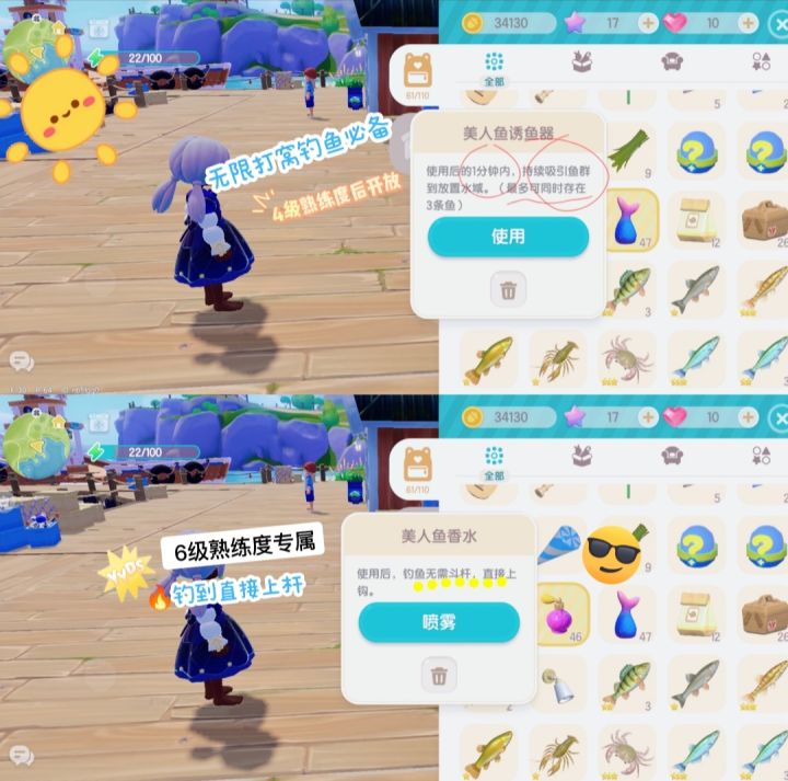 🔥🔥🔥:4级之前因为我们只能在有鱼影的地方钓鱼所以我们一开始要去找鱼多的地方就比如图二缓风海这里,大家不想乱走找鱼这个地方🔥个人感觉🔥是鱼种类最多的地方可以最快升到4级熟练度,等到4级后就可以解锁美人鱼诱捕器,这个东西就是可以让我们吸引鱼群,从而更容易钓鱼,因为我们前期在4级一直在暖风海这个地方,所以4级后有人诱捕器就可以到处钓🐟