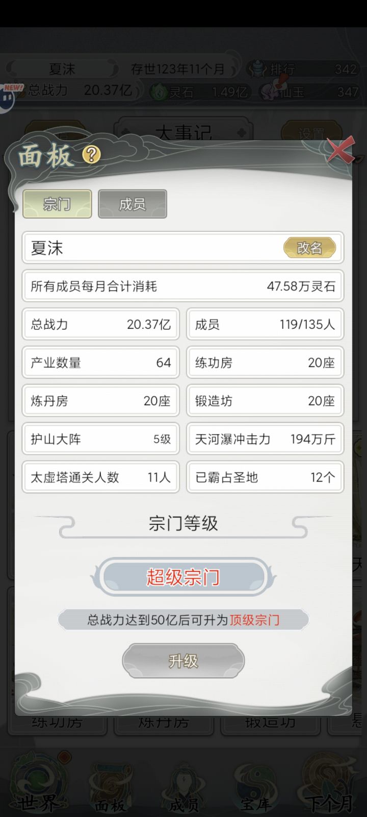 入坑注意几点,天河升到8就满级,觉醒体质的时候看着最低9星或者10星在觉醒!其他宗门能灭的就灭,能收就收,会给你上供!大道也攒着一次性觉醒一星大道!男女搭配战力加倍!最高10%所以尽量撮合!产业不要用广告升级,能建黑市的时候就把低级的拆除,全部弄成黑市,省去了看广告的时间,练功房也是,能建500倍重力的时候,把其他拆了全建500倍!弟子进阶的时候在本阶段保留4个就可以,等这4个都能提升的时候一次性提升道下一个阶段,要不3个弟子不能门比,获取功绩很慢,这样战力提升也就很慢
