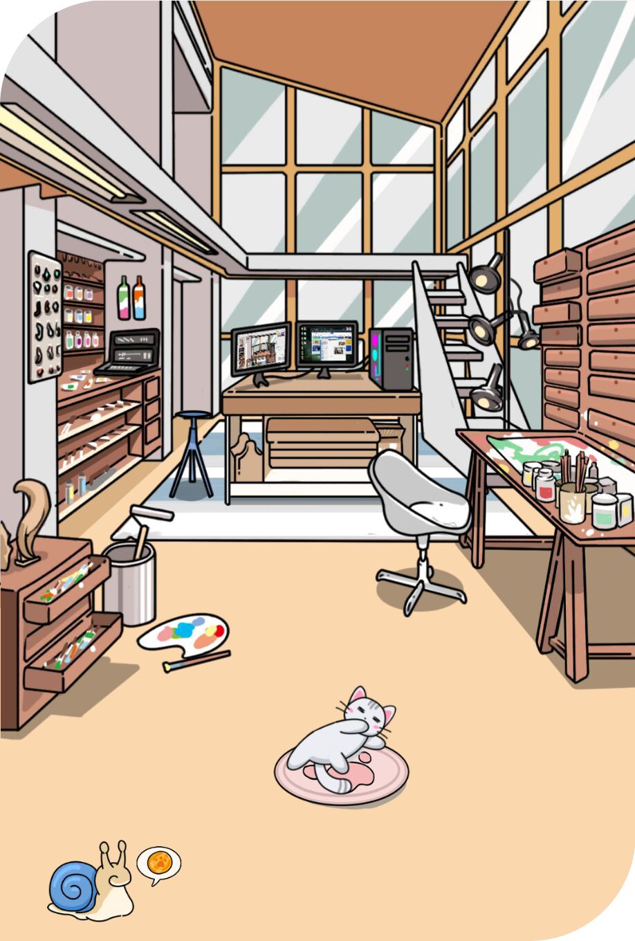 哈哈,大家是不是以为小编放出的是卧室的图片,没想到吧,为了这个工作室,小编可是奋战到了大半夜哦,怎么样现代风的工作室,配上木质风格的油画台,是不是还蛮违和哒?还有斥资买的可爱小垫子,看猫猫这安逸的~