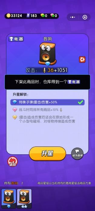 新手阶段的辅助大核心就是音响啦。音响当它在货架被下架时,仓库里会获得一个电器呢,也就是说对于电吹风而言,买一个音响上架后在下架,会获得两份攻击力加成,是不是很赚呢~