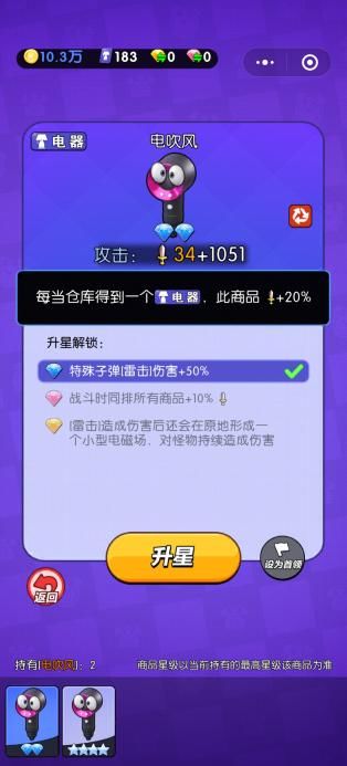 电吹风是每当仓库获得一个电器,就可以给电吹风增加攻击力,所以每次买电器时记得不要直接上架,先往仓库里一放,之前在水果篇里介绍的香蕉也是这样的功能呢,所以当有了电吹风,就嘎嘎买电器往仓库里放吧~