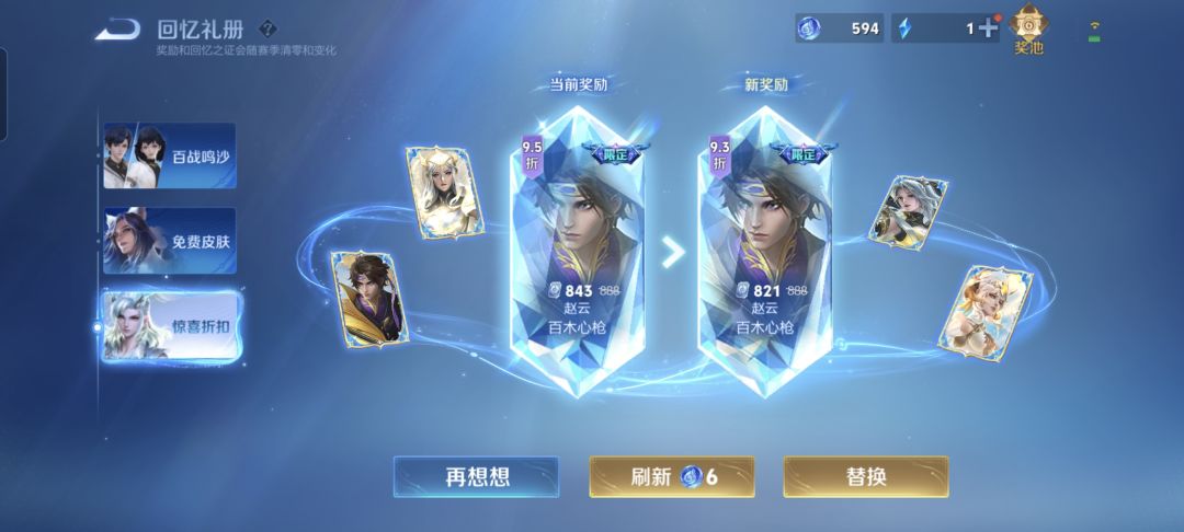 开始刷新奖池之前,我一共有606个回忆之证,刷「惊喜折扣」奖池和刷「免费皮肤」奖池一样,都是一次消耗6个回忆之证,从上图可以看到,我首次刷新就出了赵云的百木心枪。