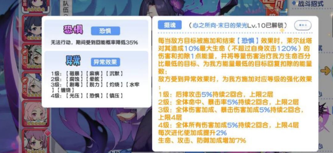 1、每当敌方目标被施加和结束【恐惧】效果时,莱尔丝塔对其造成10%最大生命(不超过自身攻击120%)的伤害和扣除1点能量,并将等量伤害治疗我方生命百分比最低的目标、为我方能量最低的目标回复扣除的能量数;