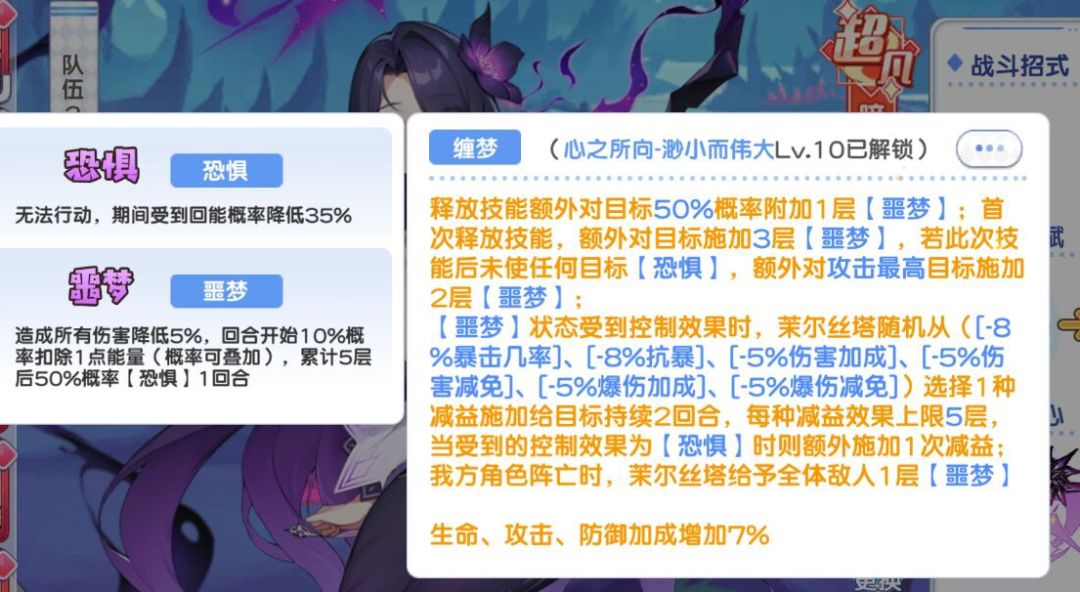 3、【噩梦】状态受到控制效果时,莱尔丝塔随机从([-8%暴击几率]、[-8%抗暴]、[-5%伤害加成]、[-5%伤害减免]、[-5%爆伤加成]、[-5%爆伤减免])选择1种减益施加给目标持续2回合,每种减益效果上限5层,当受到的控制效果为【恐惧】时则额外施加1次减益;